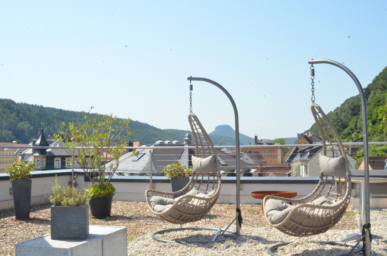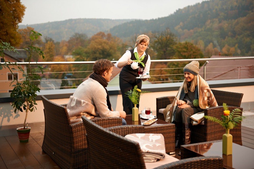 Fühlen Sie sich wie der Dichter Thedor Körner, der Bad Schandau einen 'Kraft- und Prachtplatz der Natur' nannte. Wahre Sinnes-Höhenflüge erwarten Sie auf der Dachterrasse. Umhüllt von waldumsäumten Felsen, genießen Sie kleine Köstlichkeiten bei einem grandiosen Blick über die Stadt.
