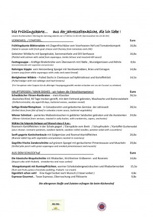 Klassische regionale und aromatische Frischeküche aus dem Kalender der Jahreszeiten und Produkten aus unserer Heimat schreiben die Speisekarte von Küchen- und Metzgermeister Burkhard Schork. Die Erfahrung aus den besten Häusern Deutschlands wird an Mitarbeiter und Gäste weitergegeben.