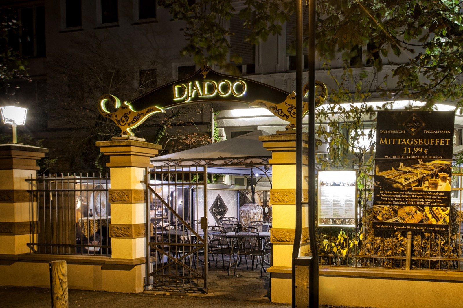 Im Restaurant Djadoo möchten wir nicht weniger als Sie zu verzaubern. Wie unser Name schon sagt ('Djadoo' bedeutet übersetzt 'Zauber') erleben Sie bei uns in Darmstadt, mit allen Ihren Sinnen, was der Zauber des Orients an Schönheit bereithält. Mit liebevoll zubereiteten Speisen und einem gehobenen Ambiente, möchten auch wir Sie verzaubern. Der Orient als authentisches Erlebnis und eine besondere Atmosphäre erwartet Sie in unserem Restaurant in Darmstadt.