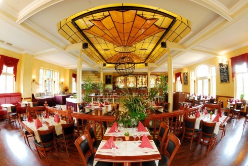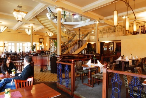 Über eine weit geschwungene Treppe gelangt der Gast in das Obergeschoss unter die farbige und einzigartige Glaslichtkuppel mit ihrer einladenden Illumination, welche ein außergewöhnliches Flair verbreitet. Warme Farben, dunkles Parkett und raffinierte Fliesenkombinationen mit eingelassenen Mosaiken nebst grandiosem Blick auf den Carolasee geben dem neuen Restaurant eine unverwechselbare und einzigartige Note.