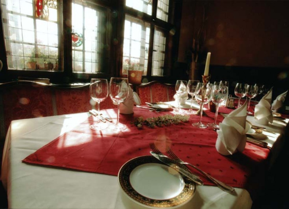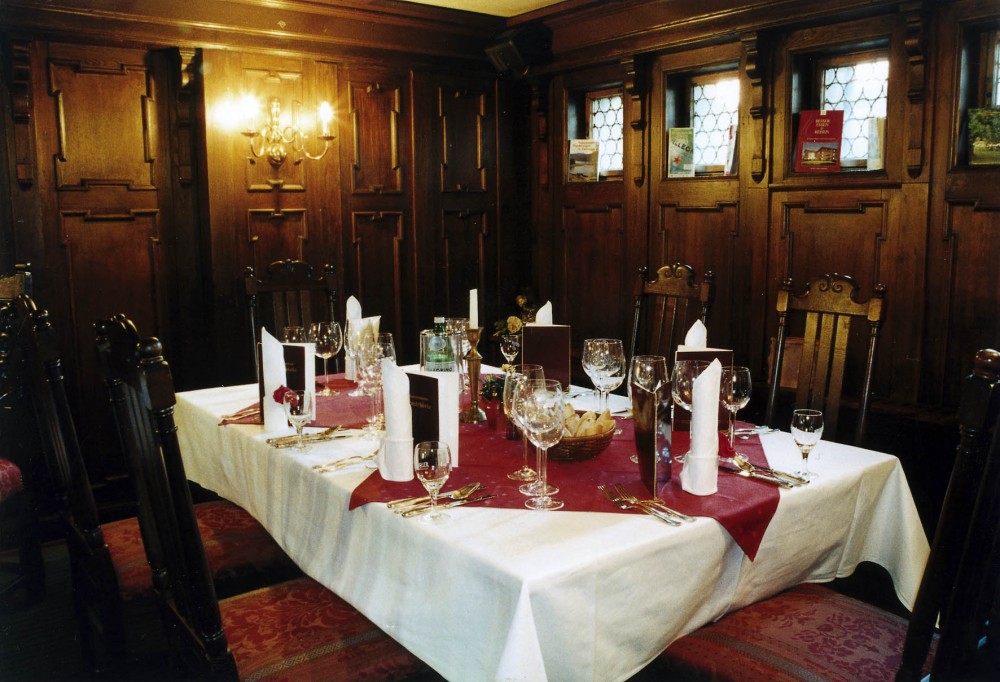 Die Gäste beeindrucken vor allem schöne Bleiglasfenster und alte Gobelins, das historische Gestühl an fein eingedeckten Tischen und die mit schmiedeeisernem Blütengeländer begrenzte Empore.