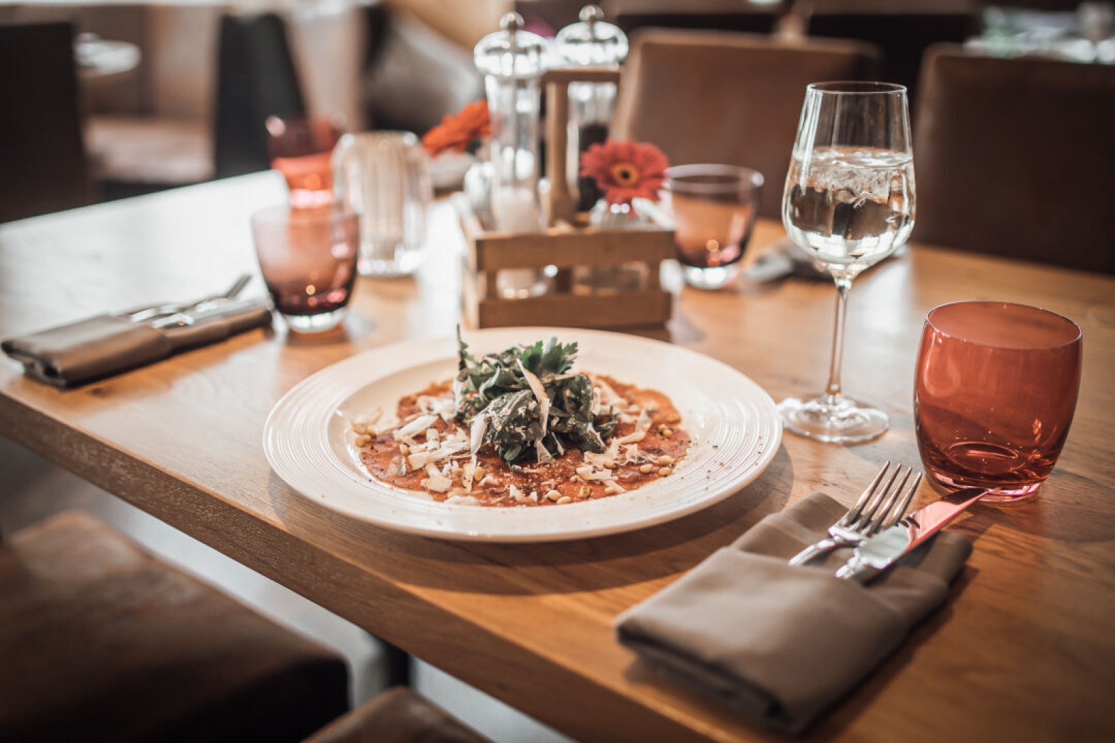 Die Vorspeisenkarte umfasst unter anderem Carpaccio vom Eifelrind, Feldsalat, Ofenkartoffeln, Pastinakensüppchen und hausgemachte Rinderkraftbrühe. Besonders hervorzuheben ist hier die hausgemachte Rinderkraftbrühe mit Markklößchen, die das Restaurant Max und Moritz in Ettringen besonders stolz ist.