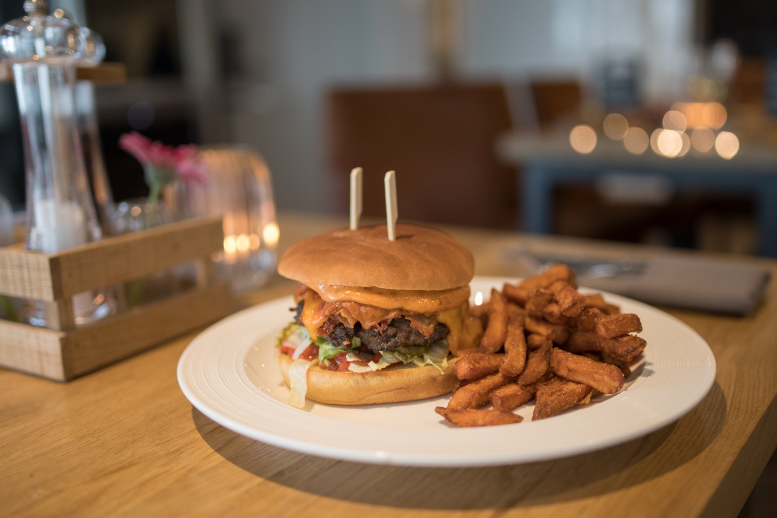 Das Restaurant Max und Moritz in Ettringen bietet auch eine große Auswahl an Beilagen, wie z.B. Süßkartoffelpommes, die als Beilage zum Beefburger serviert werden und ein besonderer Genuss sind.