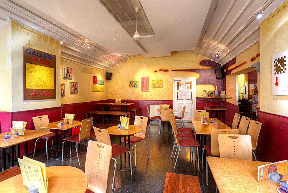 Monatlich wechselnde Kunstausstellung bekannter + neuer Künstler, große Kinderspielecke, Kinderstühle u, Baby-Wickeltisch. Freundliches, weltoffenes Personal, das seine Individualität bewahrt hat.