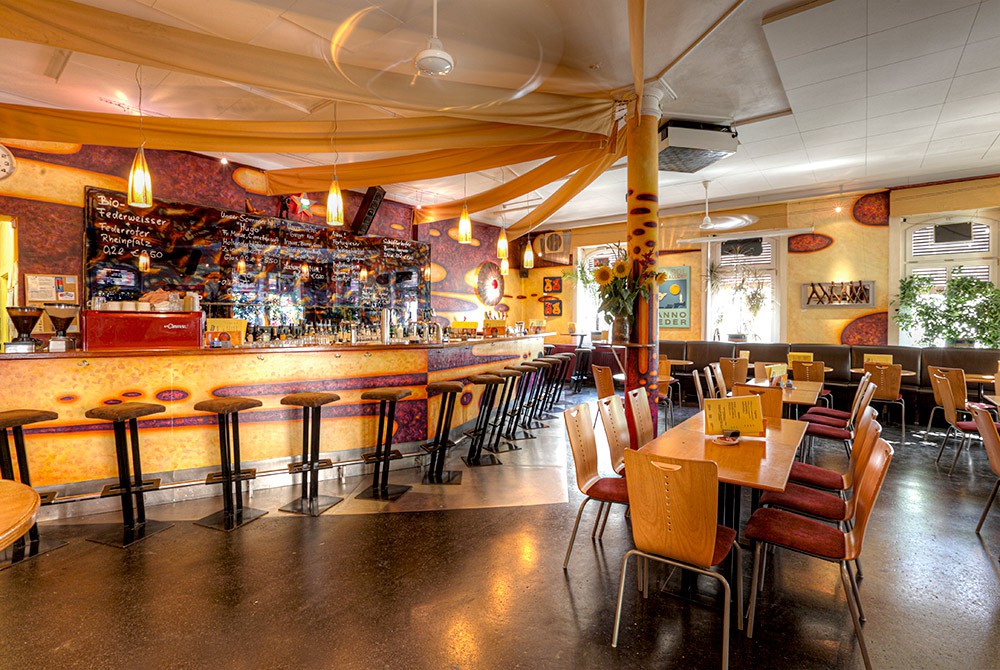 Modernes, stilvolles Ambiente von Künstlern gestaltet, Antikmosaikspiegel aus Mailand, Toilettentüren bemalt von Jo Menke, jährliche 6-wöchige Renovierung (Juli/August), regelmäßige farbliche Umgestaltung des Lokals. Seit August 2012 künstlerische Wandbemalung in gelb-orange/aubergine von Peter Damm (peter-damm.com)