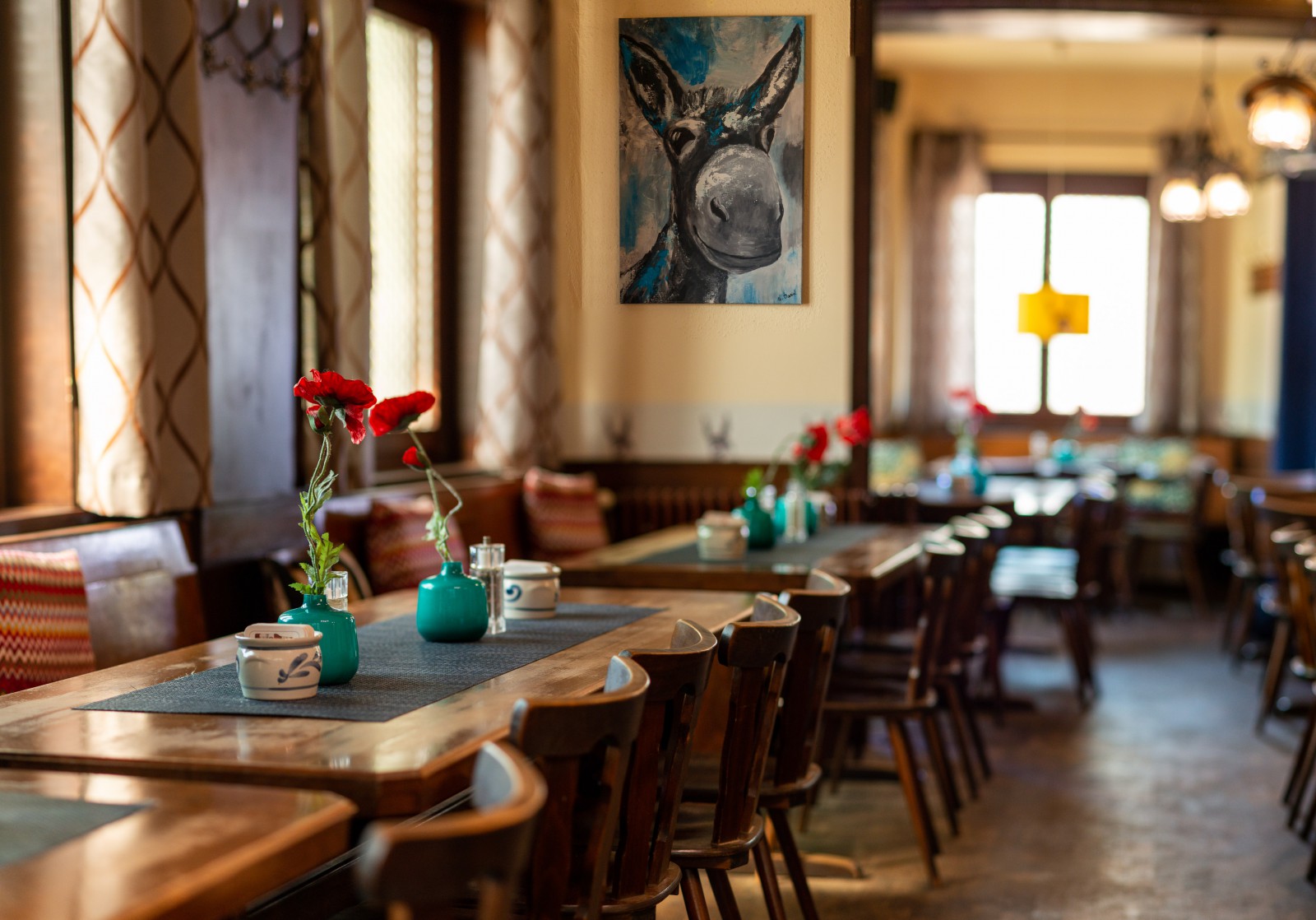 Durch seine verschiedenen Räumlichkeiten bietet der „Lahme Esel“ genügend Platz, sowohl für ein gemütliches bei Einander sitzen, als auch für kleine und große Gesellschaften. Während der Freiluftsaison locken die überdachte Terrasse und der idyllisache Garten mit altem Baumbestand. Und auf dem hauseigenen Spielplatz fühlen sich auch die kleinen Gäste gut aufgehoben.