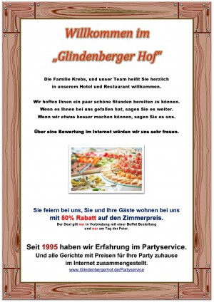 Wir haben am 06. Juli 2019 hier im Hotel „Glindenberger Hof“ eine kleine Geburtstagsparty (knapp 40 Personen) gefeiert. Also, wer so richtig guten und schnellen Service erfahren möchte, auf super Musik und Unterhaltung nicht verzichten und auch gut essen will, der ist hier genau richtig. Los ging es bereits im Vorfeld, bei der Menüabsprache und der Auswahl der Getränke /-karte, sowie der Reservierung der Zimmer für unsere Gäste. Das Buffet war umfangreich und perfekt präsentiert. Einfach … eine Augenweide. Das Personal, angefangen von der Chefin, den Leuten in der Küche, dem Kellner und der genauso gut gelaunten Kollegin hinter der Theke war einfach nur super.