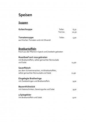 In gemütlicher Atmosphäre genießt man hier sein Bauernfrühstück, hausgemachtes Sauerfleisch oder Roastbeef. An Kleinigkeiten werden spanische Tapas angeboten und des Weiteren gibt es eine regelmäßig wechselnde saisonale Wochenkarte. Immer mit einem vegetarischen Gericht zur Auswahl. Auf speziellen Wunsch werden auch gerne die Bratkartoffeln oder das Bauernfrühstück vegetarisch zubereitet und auf Anfrage werden auch gerne veganen Wünschen erfüllt.