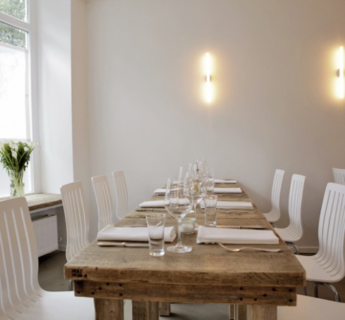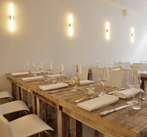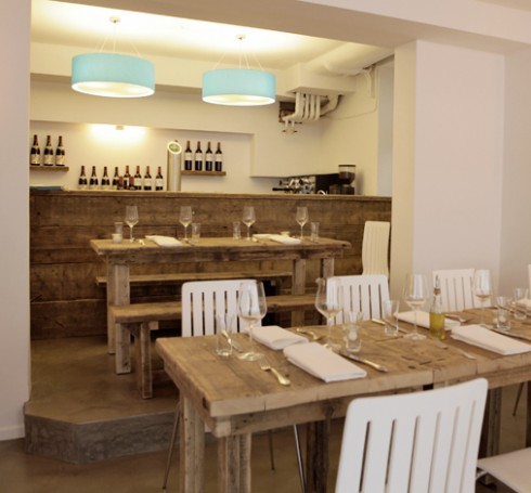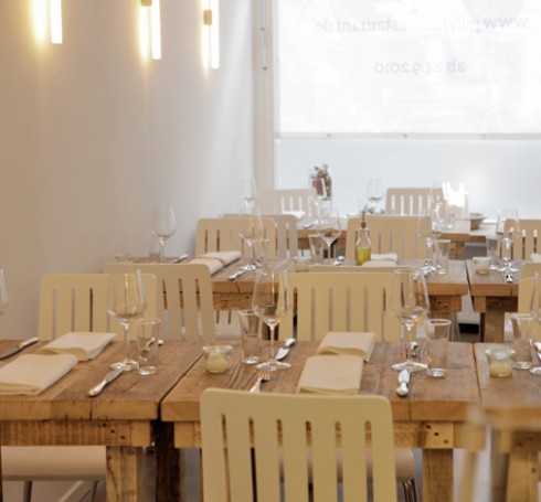 Der natürlich-schlichte Gastraum mit rustikalen Tischen und einer Bar im Treibholzlook und modernen Designelementen bietet 42 Gästen Platz.