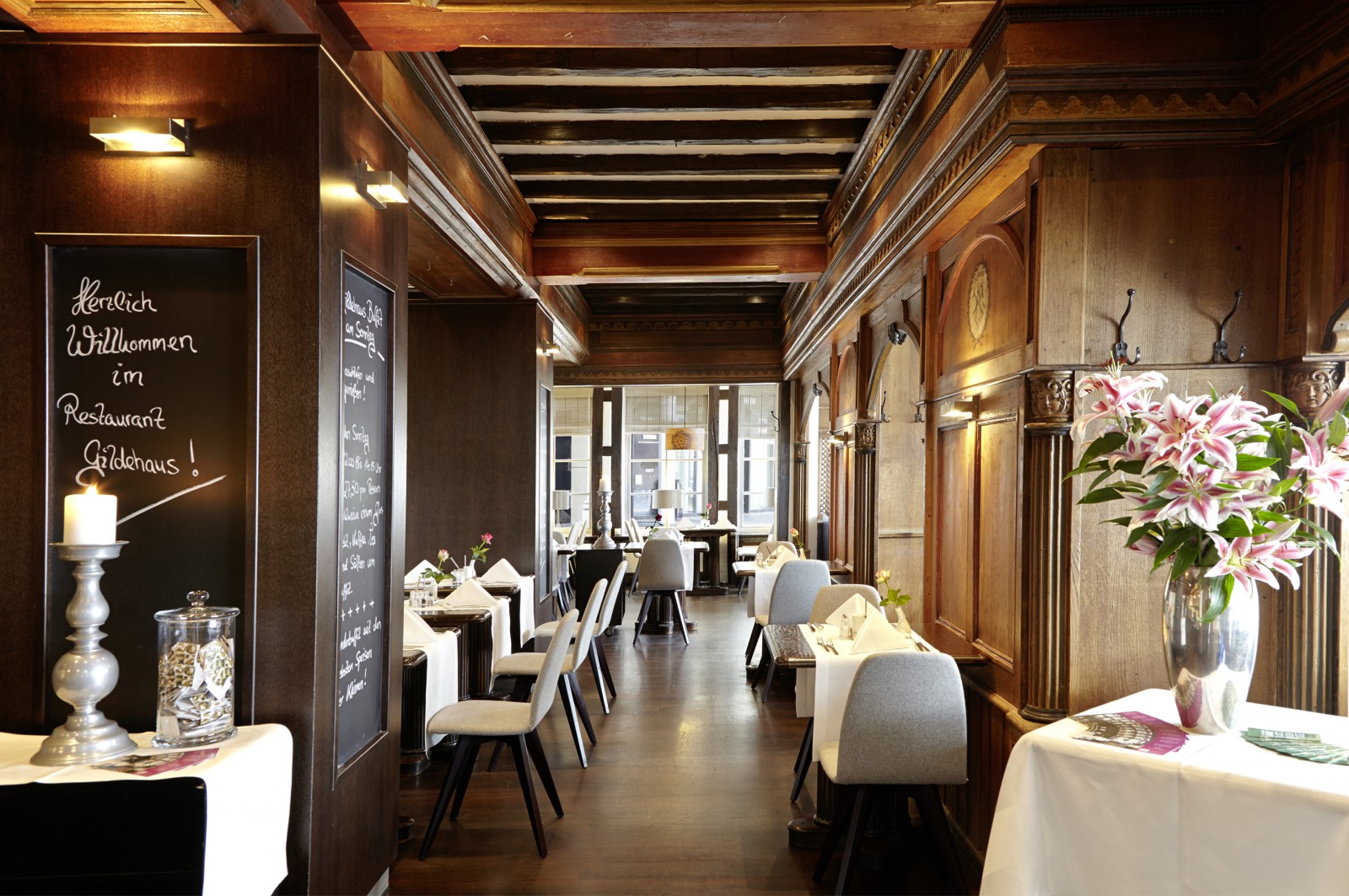 Im Restaurant Gildehaus erwartet Sie ein stilvolles Zusammenspiel von Historie und Moderne - von dunkelbraunem Fachwerk und hellweißen Akzenten - das Erlebnis eines vielfältigen, gastronomischen Konzepts.
