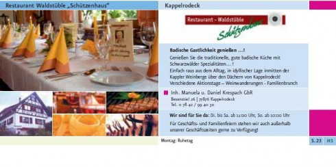 Aktuelle Restaurant-Nachrichten von Restaurant Waldstüble Schützenhaus in KappelrodeckEs liegen zur Zeit leider keine aktuellen Nachrichten von diesem Restaurant vor. Sind Sie der Besitzer? Loggen Sie sich hier ein, um aktuelle Nachrichten aus Ihrem Restaurant zu veröffentlichen. |