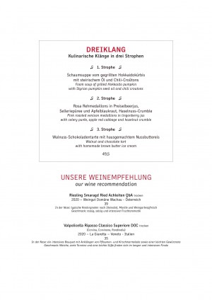 Bei uns im Restaurant musics servieren wir unseren Gästen täglich frisch zubereitete, passend zur Saison kreativ komponierte Gerichte. Unsere Küche kocht nach dem Leitsatz „Regionaler Genuss mit internationalen Einflüssen“. Mit viel Liebe stellt das Küchenteam unter Leitung von Küchenchef Matthias Mayr mindestens vier Mal im Jahr die neue musics-Karte zusammen. Auch das dreiKLANG-Menü, welches unsere Gäste besonders gerne vor Konzerten genießen, wird mehrmals pro Jahr angepasst. Unser Restaurant ist unmittelbar mit der Konzerthalle verbunden, unsere Besucher sowie Hotelgäste erhalten exklusiven Zugang via direktem Übergang. An Konzertabenden stehen neben dem Drei-Gänge-Menü auch die Speisen unserer speziellen Konzertkarte zur Auswahl.