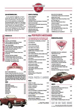 Das MOTORWORLD Inn München ist der natürliche Treffpunkt von Petrol Heads aller Herren Länder, aber auch von MOTORWORLD-Besuchern, die sich in dieser mit viel Liebe gestalteten, nostalgischen Werkstattatmosphäre einfach nur wohl fühlen. Kulinarisch dreht sich alles um ausgewählte Food-Klassiker der Automobil-Nationen Italien, USA und Good Old Germany.