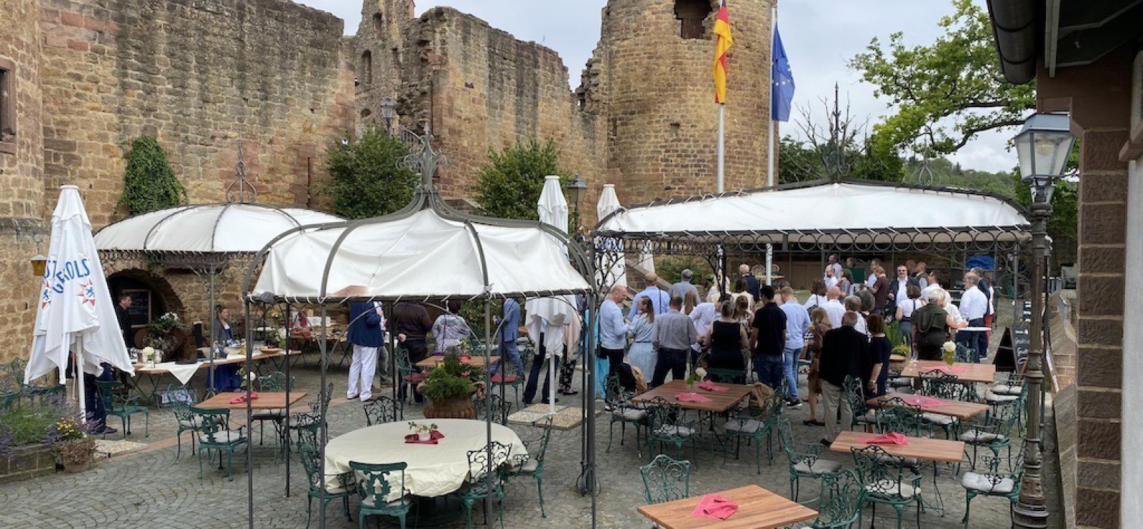 Einer der schönsten Burggärten Deutschlands. Schmiedeeiserne Pavillons, gusseisernes Mobiliar, Terrakotta, üppige Blumenbepflanzungen und stilvolle Tischkultur schaffen ein fürstliches Ambiente im 800-Jahre alten Burghof. Jedes Detail wirkt nicht zufällig, sondern sorgfältig ausgewählt und auf das historische Umfeld perfekt abgestimmt.