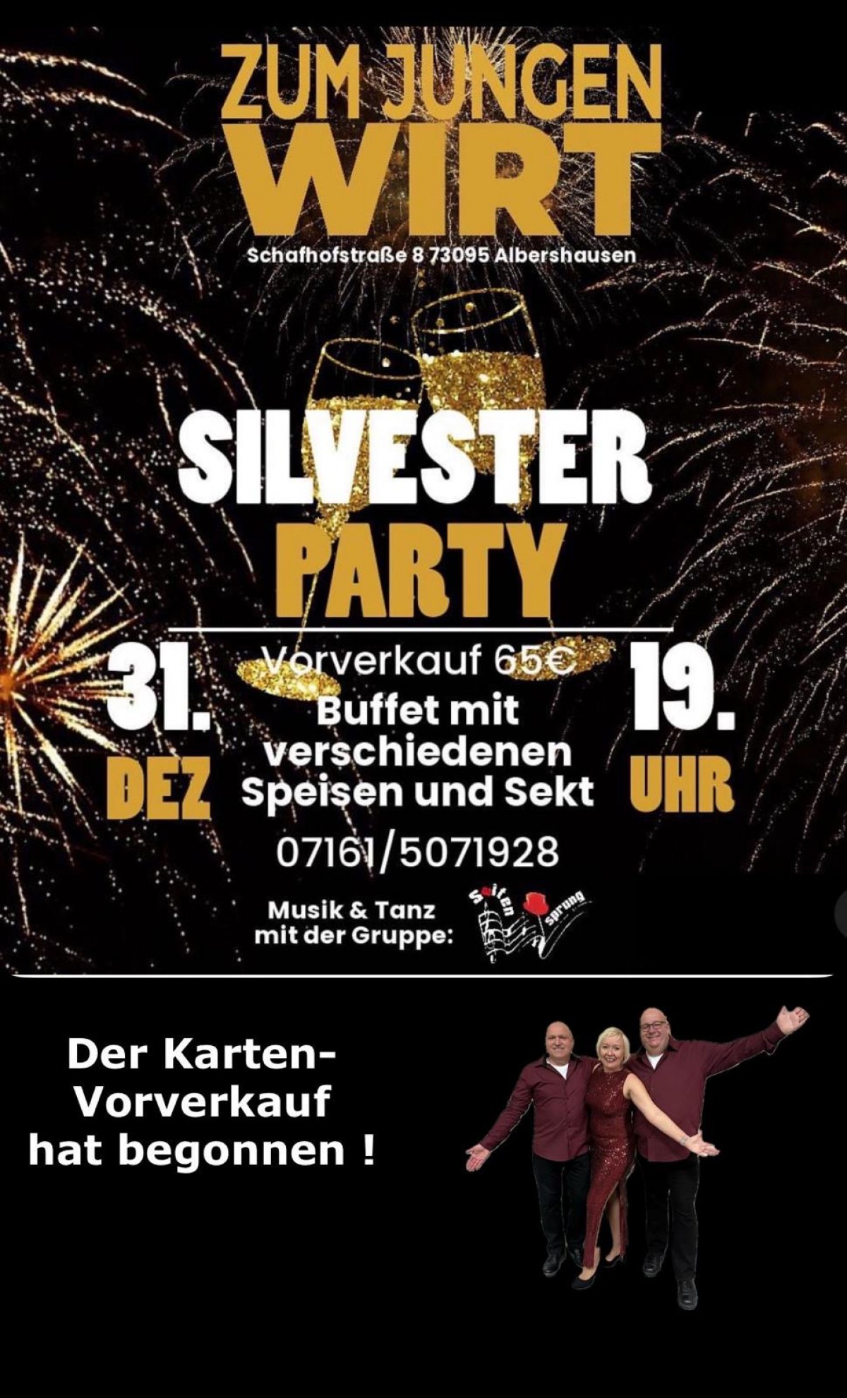 »Silvesterparty « eine Veranstaltung von Zum Jungen Wirt in Albershausen exists ![]() Am 31.12. um 19 Uhr beginnt unsere Silvesterparty beim Jungen Wirt. Mit einem leckeren und reichhaltigen Buffet werdet ihr bestens versorgt. Für gute Stimmung sorgt die Band Saitensprung. Genießt gemeinsam mit uns den tollen Abend.