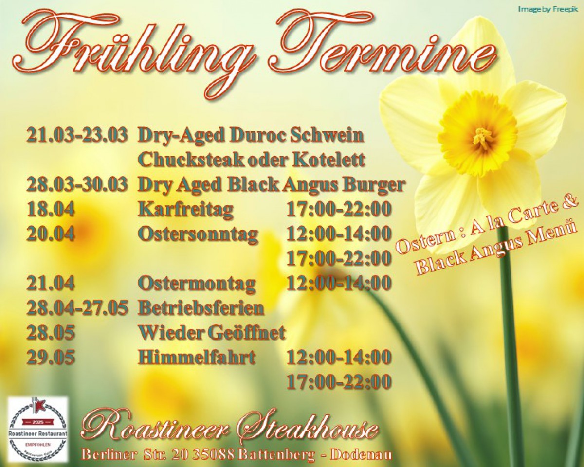 »Frühling Termine« eine Veranstaltung von Roastineer Steakhouse in Battenberg (Eder) exists ![]() Bald ist es, soweit ; FRÜHLING; unsere Termine für die kommende Zeit: