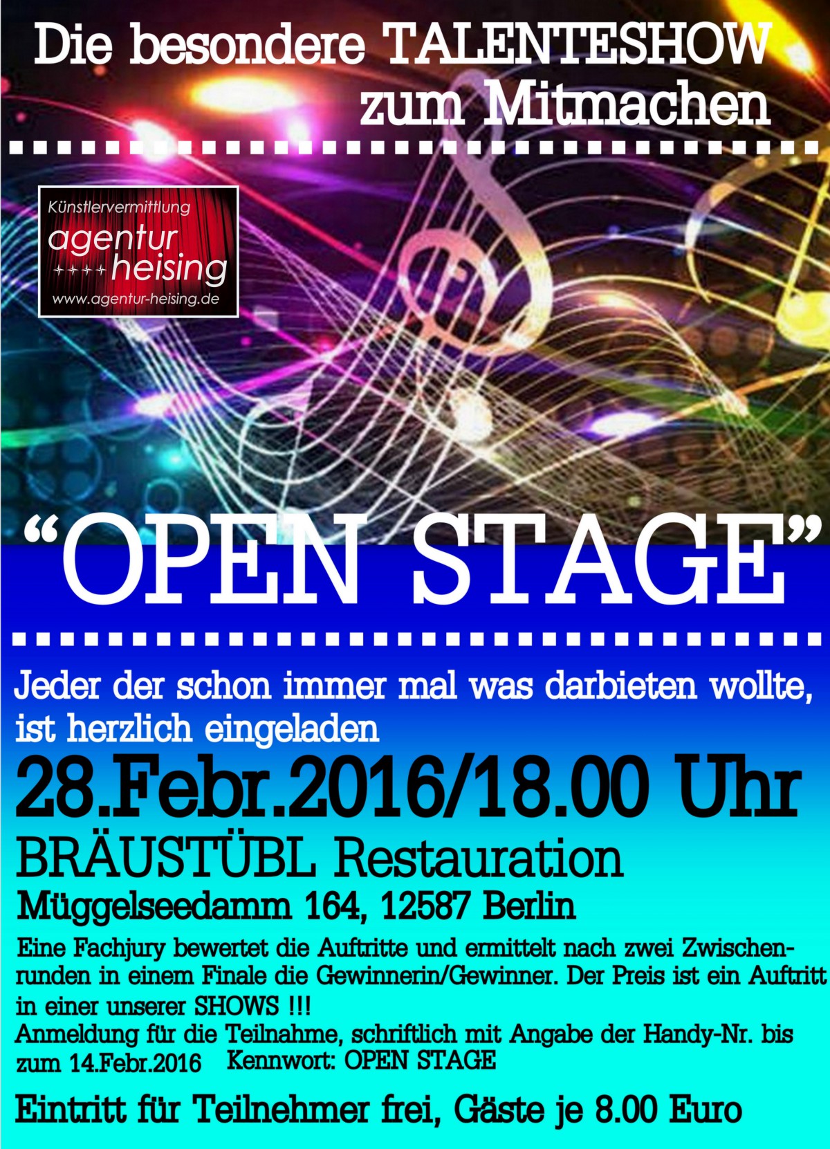 Anmeldung für die Teilnahme bis 14. Februar 2016 bitte schriftlich mit Angabe der Handy-Nummer an BRÄUSTÜBL Restauration mit dem Kennwort: OPEN STAGE, Müggelseedamm 164, 12587 Berlin. Der Eintritt für Teilnehmer ist Frei, für Gäste Kostet es je 5.00 €.