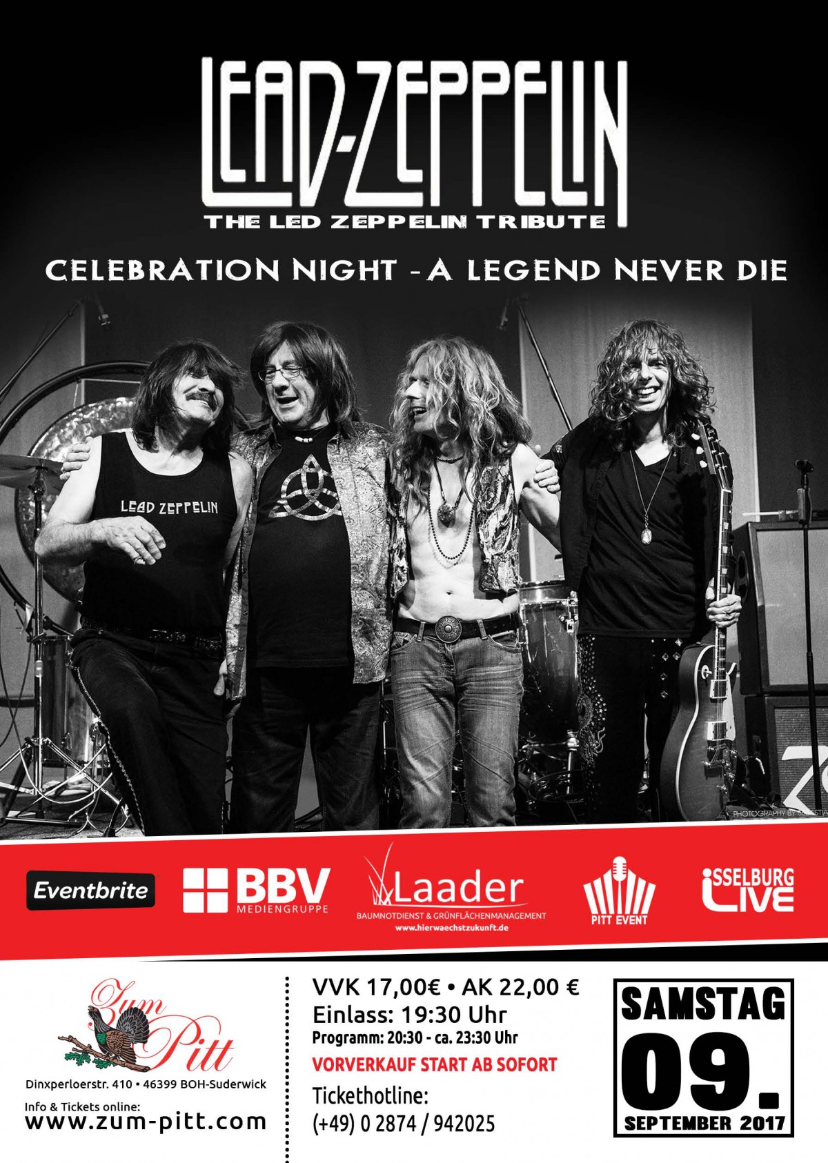 legendäre Songs von 'Led Zeppelin'. Mit “Lead Zeppelin” steht die wohl authentischste Tribute Band von Led Zeppelin Deutschlands auf unserer Bühne. Kenner wissen das und wir sind sehr froh den Fans von nah und fern, diese Band präsentieren zu dürfen. Im Sommer 2006 gründete Drummer Roby Misiejuk die Band Lead Zeppelin und erfüllte sich damit einen lang gehegten Traum. Zum Einsatz kommen fast nur authentische Vintageinstrumente. Lead Zeppelin freut sich für ein Puplikum zu spielen, welches die Songs von Led Zeppelin und deren außergewöhnliche Melodien noch immer in ihrem Herzen trägt und außerdem über ein Puplikum, dass die musikalischen Facetten und Detailarbeit in der Präsentation von Lead Zeppelin erkennt. Das Konzert findet am 09.09. 2017 im Saal der Gaststätte Zum Pitt statt. Einlass hierzu ist um 19 Uhr 30 und der Beginn um 20 Uhr 30 Die Tickets kosten17 Euro und sind wie immer beim BBV und der Gaststätte Zum Pitt erhältlich. Abonnenten des BBV zahlen dort 16 Euro. An der Abendkasse kosten die Tickets 22 Euro. Die Tickets gibt es auch online unter www.zum-pitt.de