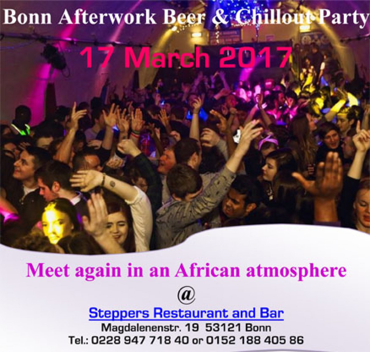 »Bonn AfterWork Beer & Chillout Group « eine Veranstaltung von Steppers Afrikanische Restaurant & Lounge in Bonn exists ![]() The beautiful group are meeting again in an African atmosphere.