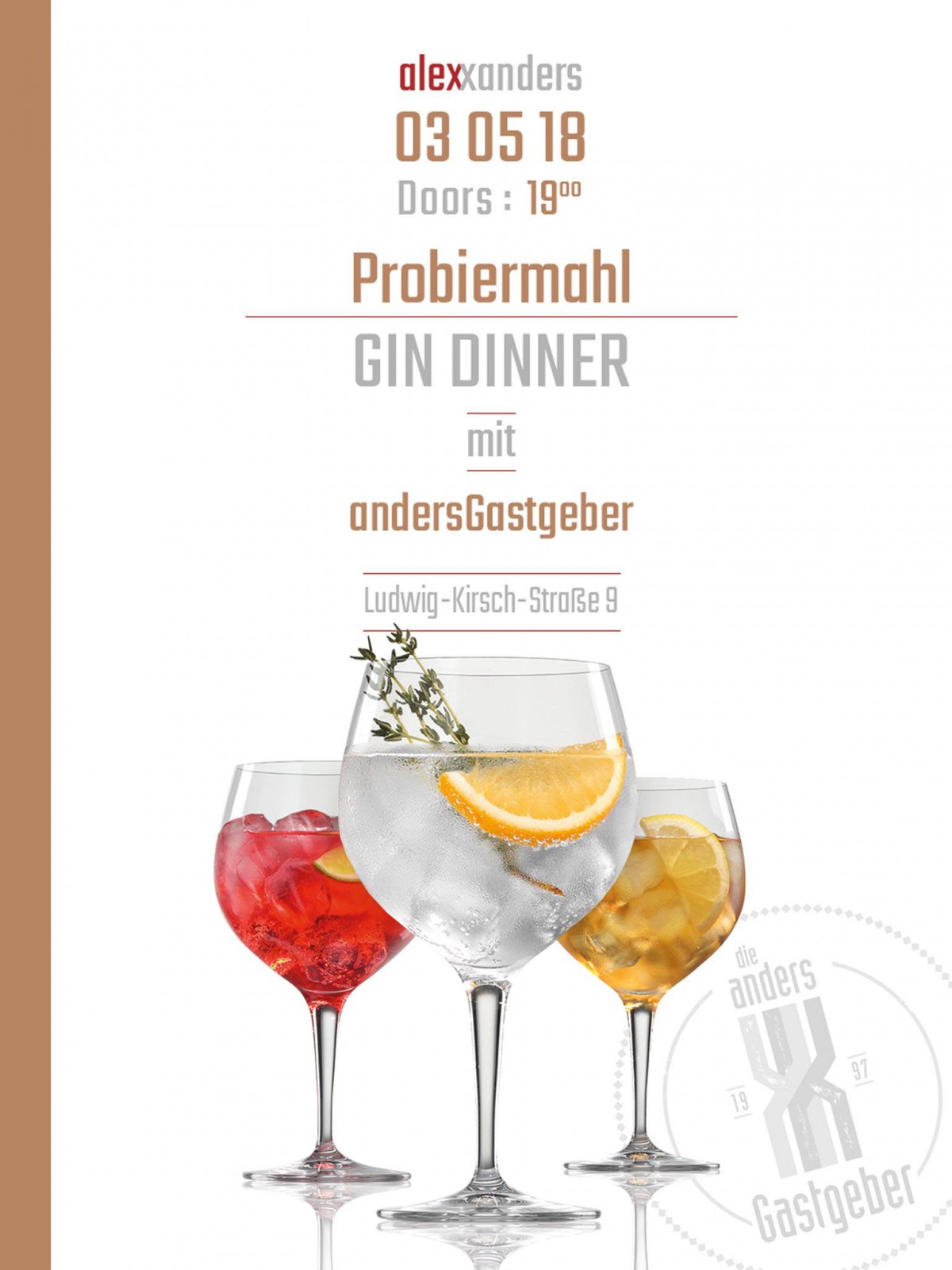 »Probiermahl! Die Tasting-Reihe im alexxanders« eine Veranstaltung von alexxanders in Chemnitz ![]() exists ![]() Gin ist ein kleiner Allrounder: Insgesamt können bei der Gin-Herstellung etwa 120 verschiedene Zutaten als Aromen und Wirkstoffe zum Einsatz kommen. Die Geschmacksvielfalt ist somit fast grenzenlos, was diese Spirituose zu einem wahren „people pleaser“, einem „Liebling der Massen“ macht. Deshalb möchte das alexxanders seine neue Tasting-Reihe „Probiermahl!“ mit eben jenem bekannten Wacholderschnaps beginnen. Wir haben uns daher am 03.05.2018, ab 19.00 Uhr den versierten Experten Sebastian Wachs eingeladen, der unsere Sky-Bar einen Abend lang zur Gin-Zone machen und allerhand Wissenswertes darüber berichten wird. Natürlich soll dabei aber nicht nur das Hirn gefüttert, sondern vor allem auch die anderen Sinne verwöhnt werden. Neben dem Erfühlen der Botanicals der jeweiligen Ginarten, wird unsere Küche an diesem Abend auch ein schmackhaftes 3-Gang-Menü kreieren, zu dem pro Gang jeweils zwei korrespondierende Gin-Sorten verkostet werden können. Im Anschluss soll der Abend mit diversen ginhaltigen Cocktails der vorgestellten Sorten einen gemütlichen Ausklang finden: von klassisch bis modern - es gibt ja nicht nur Gin Tonic! Kostenfixpunkt: 49,00 € pro Person [3-Gang-Menü inklusive 2 Gin-Sorten pro Gang; im Anschluss können Cocktails und/oder weitere Getränke an der Bar käuflich erworben werden]