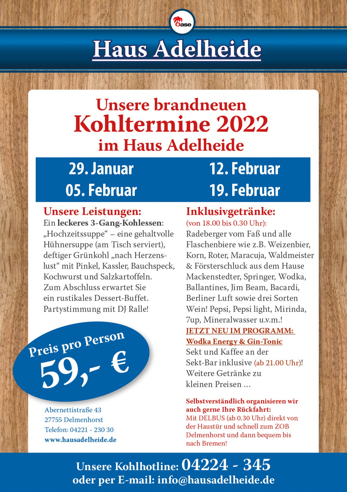 »Kohlfahrt« eine Veranstaltung von Haus Adelheide in Delmenhorst exists ![]() Ein leckeres 3-Gang-Kohlessen: 'Hochzeitssuppe' - eine gehaltvolle Hühnersuppe (am Tisch serviert), deftiger Grünkohl 'nach Herzenslust' mit Pinsel, Kassler, BauchspeckKochwurst und Salzkartoffeln. Zum Abschluss erwartet Sie ein rustikales Dessert-Buffet. Partystimmung mit DJ Ralle!