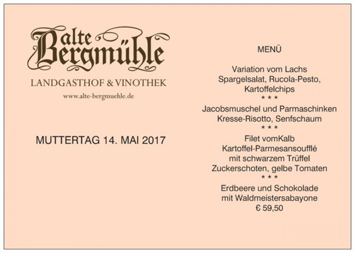 »Muttertag« eine Veranstaltung von Alte Bergmühle Landgasthof & Vinothek in Dreieich exists ![]()