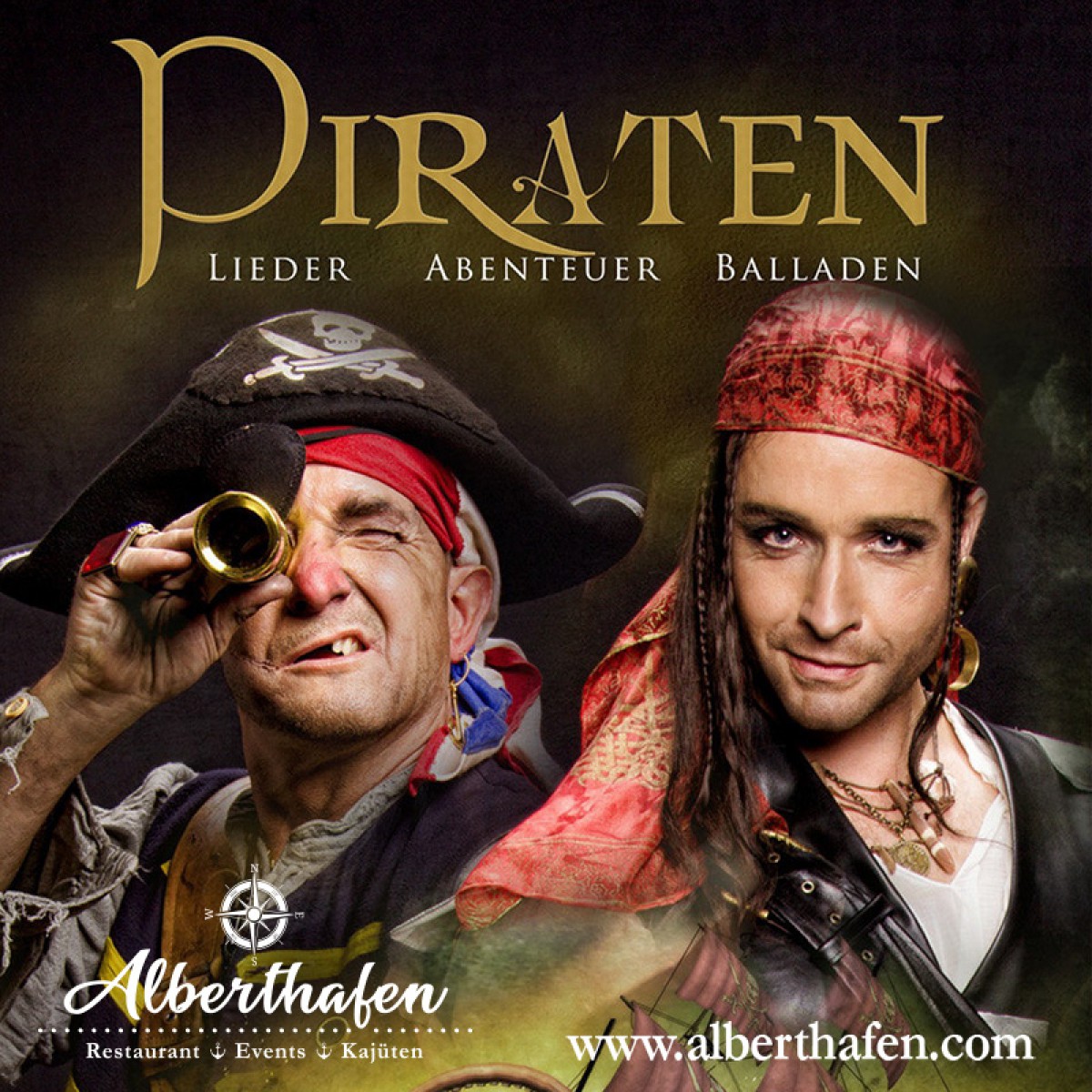 »Die Piraten-Dinner-Show« eine Veranstaltung von Alberthafen - Restaurant Events Kajüten in Dresden exists ![]() Es ist einer dieser Abende an denen man lieber früh ins Bett gegangen wäre. Der Mond versteckt sich hinter Wolken, die Planeten stehen in ungünstiger Konstellation und dann schlägt so eine Landratte auch noch die Schiffsglocke. Es ist die Nacht der Wiederkehr von Davi Jones Kiste. Die zwei verufensten und gefürchtesten Piraten der sieben Weltmeere erwachen nach 300 Jahren wieder zum Leben. Erleben Sie Captain Killers und Captain Sam Bakers furchtbare und leibhaftige Auferstehung. Mit schaurig schönen Balladen, handfesten Songs und mitreißenden Shantys erzählen Sie aus ihrem abenteuerlichen Leben als Freibeuter. Halten Sie ihr Geld und ihre Frauen ganz fest, denn die Beiden führen nichts gutes im Schilde. Wenn sie gerade noch verspielt die Gitarre streicheln, so halten sie hinterm Rücken schon das Entermesser bereit, um ihren nächsten Raub, oder ihre nächste Teufelei auszuführen. Sie machen dabei nicht mal vor dem hiesigen Finanzamt halt.