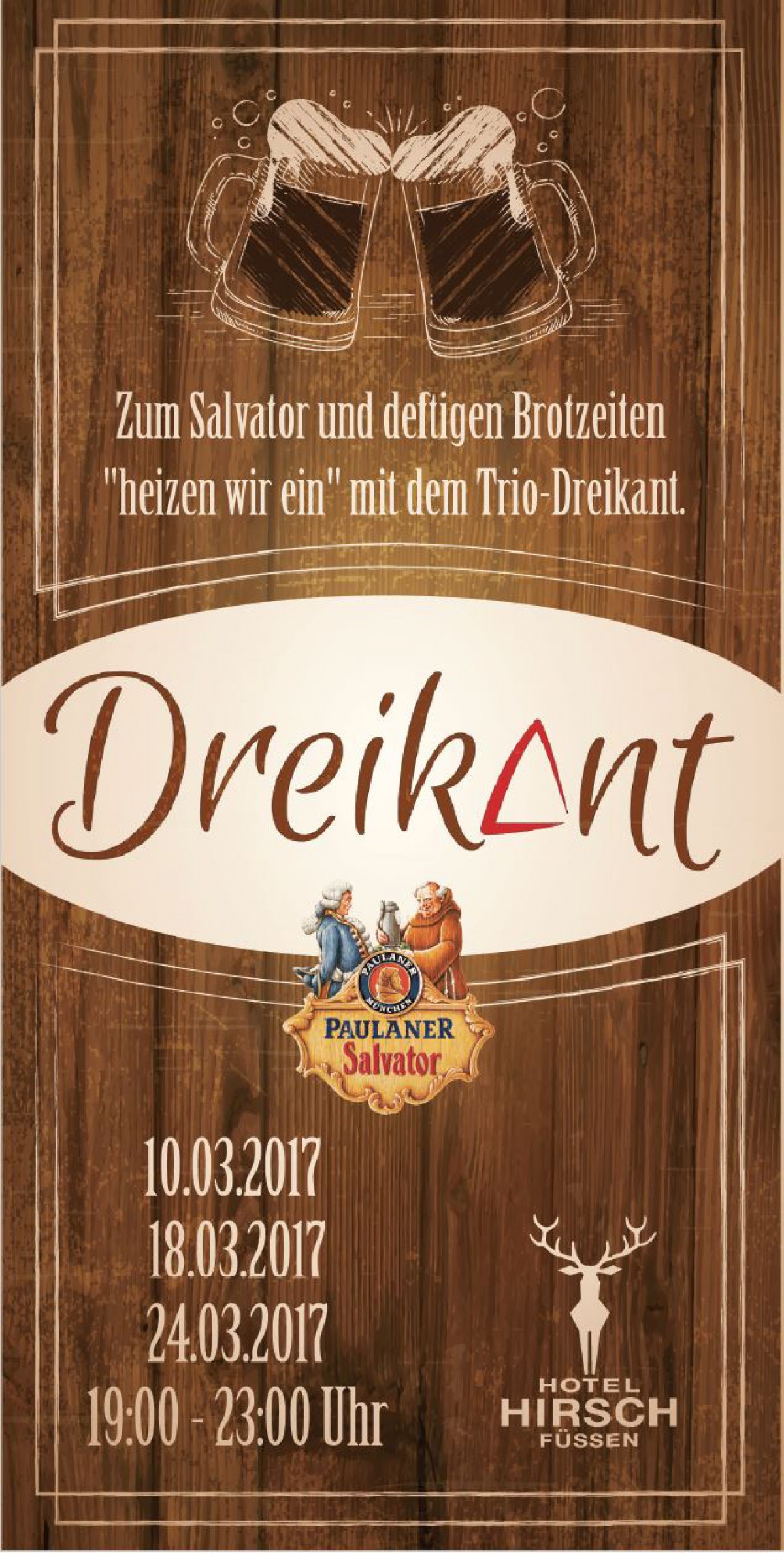 An diesem Abend spielt bei uns 'Dreikant' und sorgt bei deftigen Brotzeiten und kühlem Salvator Starkbier für Stimmung.