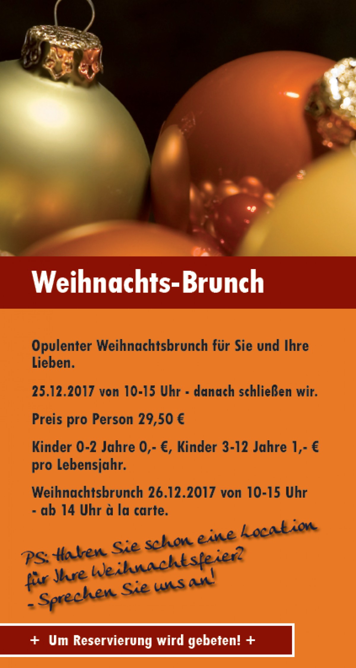 Lieben. 25.12.2017 von 10-15 Uhr - danach schließen wir. Preis pro Person 29,50 € Kinder 0-2 Jahre 0,- €, Kinder 3-12 Jahre 1,- € pro Lebensjahr.