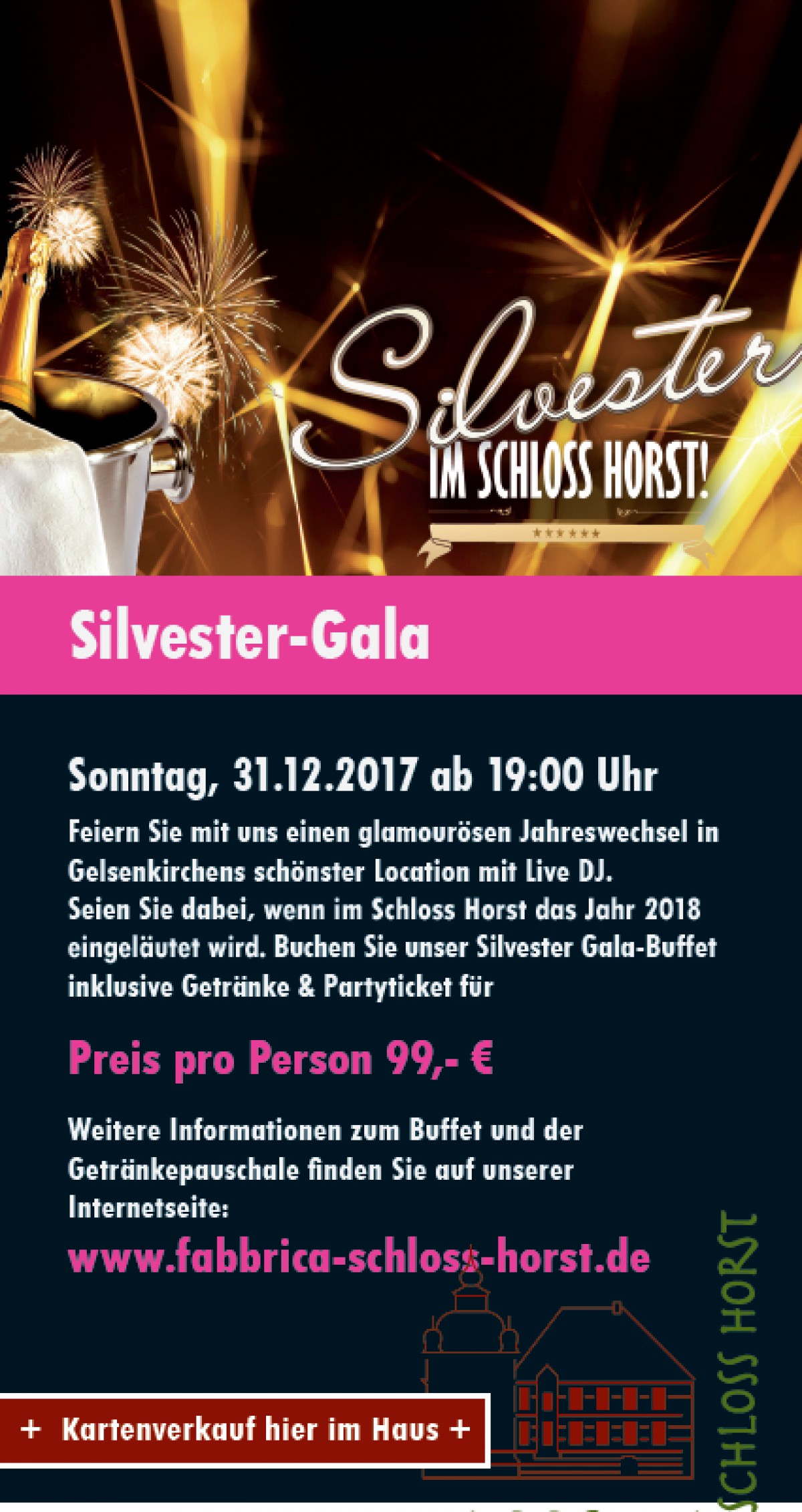 Feiern Sie mit uns einen glamourösen Jahreswechsel in Gelsenkirchens schönster Location mit Live DJ. Seien Sie dabei, wenn im Schloss Horst das Jahr 2018 eingeläutet wird. Buchen Sie unser Silvester Gala-Buffet inklusive Getränke & Partyticket für Preis pro Person 99,- € Weitere Informationen zum Buffet und der Getränkepauschale finden Sie auf unserer Internetseite: www.fabbrica-schloss-horst.de