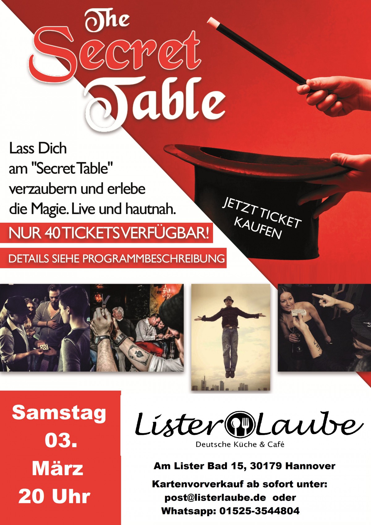 • Immer an unterschiedlichen Orten. • Immer in lockerer Atmosphäre, meistens in Verbindung mit Speisen und Getränken. • Immer im kleinen Kreis von max. 40 Gästen. Karten: 20,- € pro Person Das besondere an unserer Zaubershow ist, dass die Gäste Magie so nah erleben wie nie zuvor. Die Gäste sitzen am Tisch des Magiers und können die unglaubliche Show aus einer Entfernung von maximal 3-4 Metern miterleben. Wer vorher Essen möchte kann das von 18 - 20 Uhr. Bitte reserviert einen Tisch. Wichtig: Der Kartenvorverkauf läuft ab sofort. Da es nur 40 Karten für die Show gibt, bitte rechtzeitig reservieren. Karten gibt es in der Lister Laube oder per Mail unter: post@listerlaube.de Presseinformation: Norman Gatsby verzaubert mit neuem Konzept. Es ist 1993, und ein elfjähriger Junge sitzt in Frankfurt vor dem Fernseher. Er sieht die Show eines Mannes, der die Menschen verzaubert und verblüfft. Und den kleinen Jungen auch. Die Show von David Copperfield verändert das Leben des Jungen. Er will Magier werden. Heute ist Norman Gatsby einer der besten Magier Deutschlands. 2007 nahm er an der RTL Show 'Das Supertalent' teil und belegte dort Platz 10 von über 5.000 Teilnehmern. Er war Berater für zwei Uri Geller Shows auf Pro 7 und ist neben seinen eigenen Shows für nationale und internationale Magier beratend tätig. Prominente wie Uri Geller, Dieter Bohlen, AZAD, Marco Schreyl, Ruth Moschner und Prinz Michael von Anhalt verzauberte er und brachte sie zum Staunen. Auch die Bewohner im Big Brother Container erlebten mit Norman Gatsby magische Momente. „Dabei merkte ich, das Magie und Zauberei nicht immer eine große Bühne brauchen, um zu wirken.“, sagt der inzwischen Bundesweit bekannte Magier.“Es ist einfach phantastisch, die Menschen unmittelbar zu überraschen und in staunen zu versetzen.“ Obwohl er wieder Runde für Runder weiter kam, brach er 2015 seine erneute Teilnahme an „Das Supertalent“ ab, um sich ganz auf sein neues Konzept „The secret Table“ zu konzentrieren. Zauberei im kleinen Kreis, direkt am Gast. Er etablierte diese bundesweite Eventreihe für Fans der Zauberkunst, die Magie hautnah erleben wollen. Dabei hebt sich Norman Gatsby von den klassischen 'Häschen aus dem Hut' Zauberern ab, in dem er sich selbst und Gegenstände schweben lässt. Er trickst mit Karten wie kein Anderer. Er liest Gedanken und hypnotisiert. Er verbiegt und verdreht Löffel sowie Gabeln. Er ist ein ausgezeichneter Taschendieb, natürlich nur während der Show. Und als Einziger weltweit kann er Weingläser verbiegen. „Seine Art der Zauberei heißt Magie direkt am Menschen, direkt vor den Augen der Besucher.“ erklärt Peter Dombrowski vom Management.“ Ohne große Bühne und viel Technik kommen auch kleine Locations in den Genuss, ihren Besuchern und Gästen einen tollen Abend mit Magie und spannender Zauberei bieten zu können.“