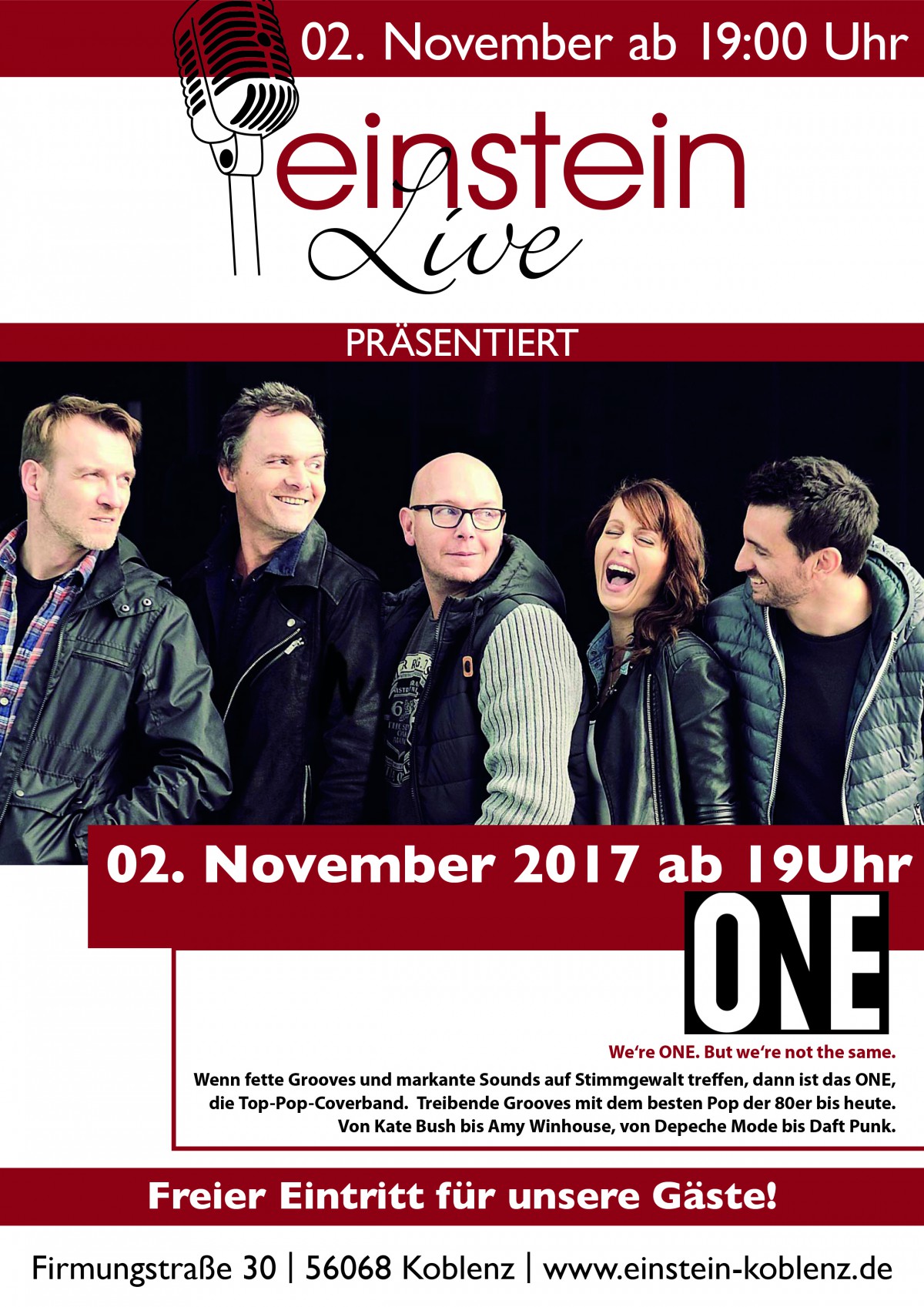 »einstein Live« eine Veranstaltung von Café Einstein in Koblenz exists ![]() Jeden 1. Donnerstag im Monat heißt es bei uns: Einstein LIVE. Wir freuen uns auf einen tollen Abend mit den besten Bands und super Stimmung.