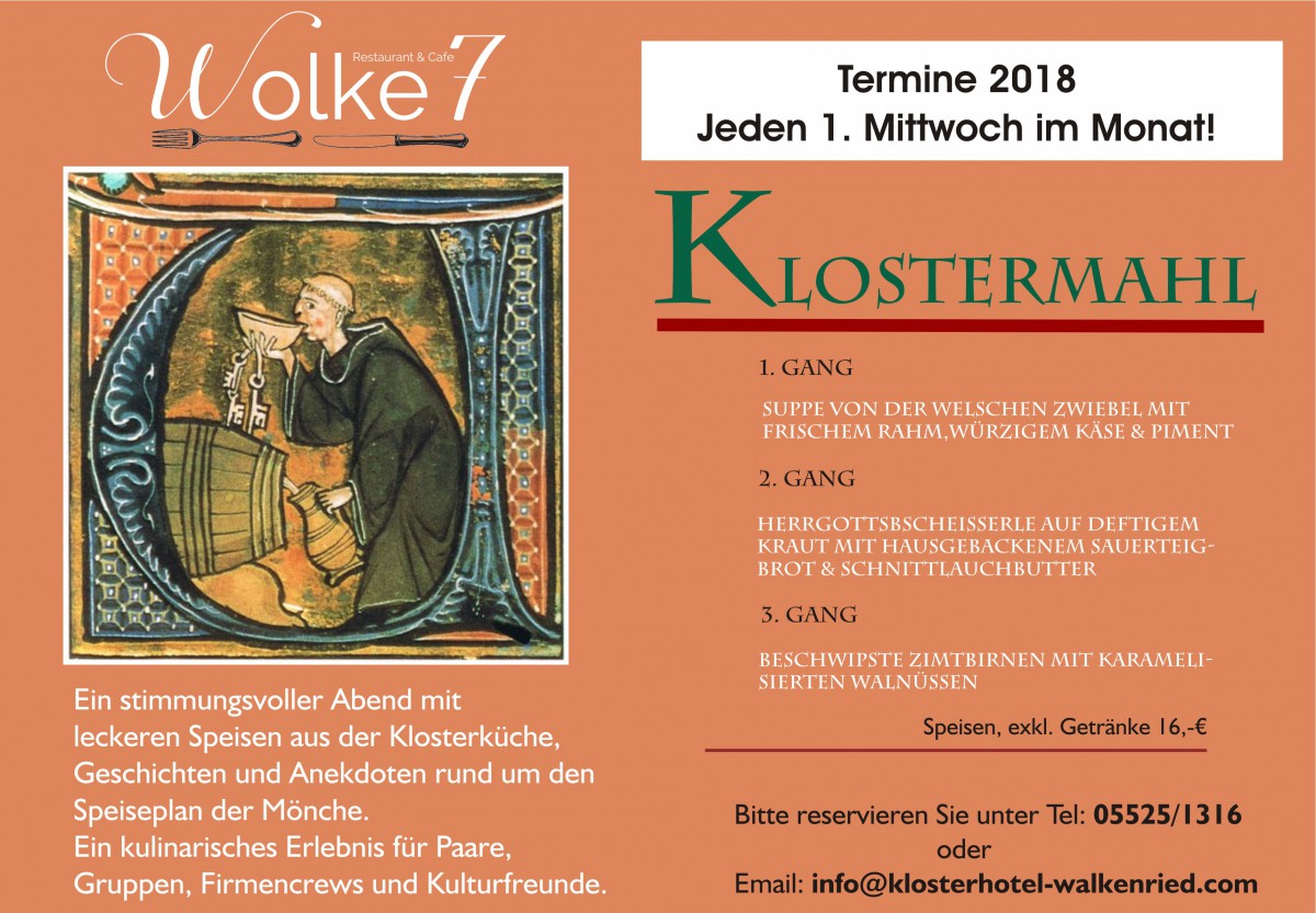 »Mittelalterliches Klostermahl« eine Veranstaltung von Wolke 7 in Walkenried ![]() exists ![]() Mittelalterliches Klostermahl in 3 Gängen mit allerlei Anekdoten aus dem Leben und Speiseplan der Mönche . Kerzenschein und mittelalterliche Musik.