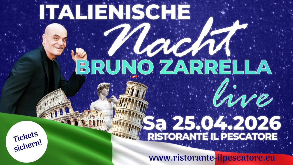 »ITALIENISCHE NACHT MIT BRUNO ZARRELLA SHOW « eine Veranstaltung von Ristorante Il Pescatore Italienisches Catering Events Hochzeiten in Schorndorf exists ![]() SAMSTAG, 25.04.2026 ITALIENISCHE NACHT – BRUNO ZARRELLA SHOW.