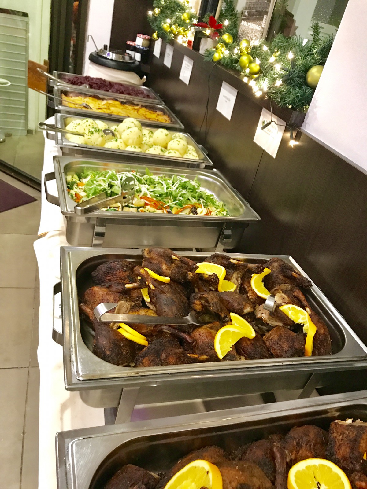 Die „Entensaison“ Am Montag, den 11.November 2022 um 18:30 Uhr Kalt - Warm Büffet Vorspeisen hausgemachter Salat von der Ente ∙ Mango ∙ Granatapfel Waldorfsalat mit Walnüssen ∙ Äpfel ∙ Sellerie Suppe Geflügelkraftbrühe mit Eierstich, Gemüse & Geflügelklöschen Hauptgänge Cherry valley Ente ∙ frisch aus dem Ofen Honig-Orangen –Sauce Beilagen Thüringer Kartoffelklöße ∙ Kartoffelgratin Apfelrotkohl ∙ Rahmwirsing Dessert Panna Cotta ∙ Mangomark **** dunkle mousse au chocolat Bei Gruppenreservierungen von 8-10 Personen gibt es einen eine Überraschung dazu Wir behalten uns vor, dass die Veranstaltung bei geringer Buchungsnachfrage abgesagt wird.