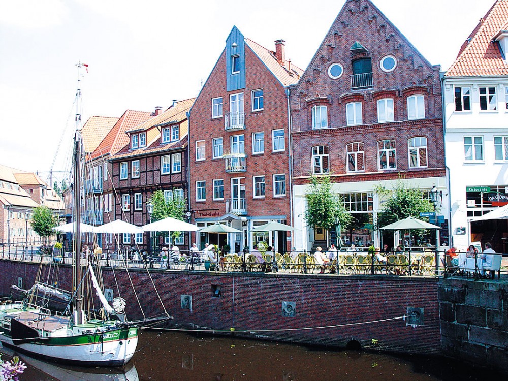 Im Sommer idyllisch sitzen auf der Außenterrasse direkt am Fleth inmitten der Stader Altstadt.