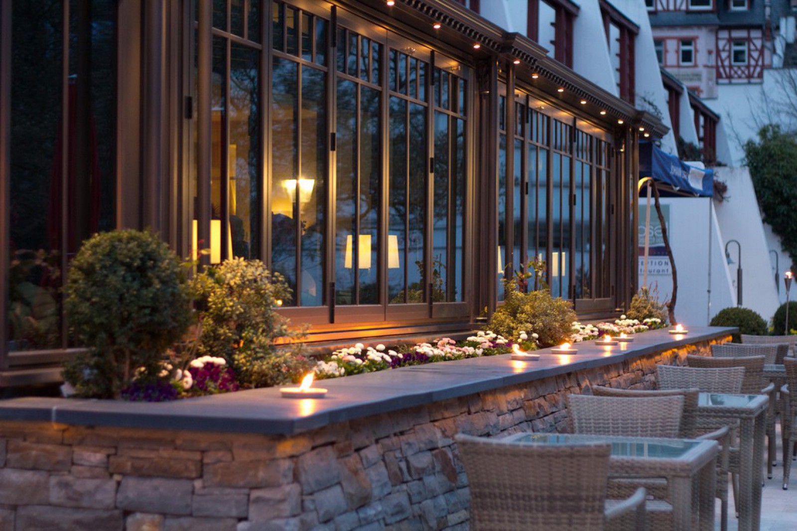 Das Restaurant "Zum Schlösschen" mit Orangerie und Naturbruchsteinterrasse, der Wein- und Biergarten mit Pavillon direkt an der Mosel sowie die MIELE Kochschule "Tafelkunst" vervollständigen das Angebot des in 2013 komplett renovierten Hauses.