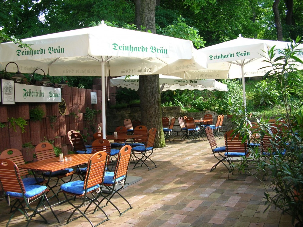Im Felsenkeller können Sie auf 170 Sitzplätzen (Wintergarten 85 Plätze und Sudhaus 85 Plätze) die traditionelle Thüringer Küche und dazu ein hausgebrautes Bier direkt neben den Braukesseln oder mit Blick über Weimar, bei schönem Wetter auch draußen im schattigen Biergarten (60 Sitzplätze) genießen.